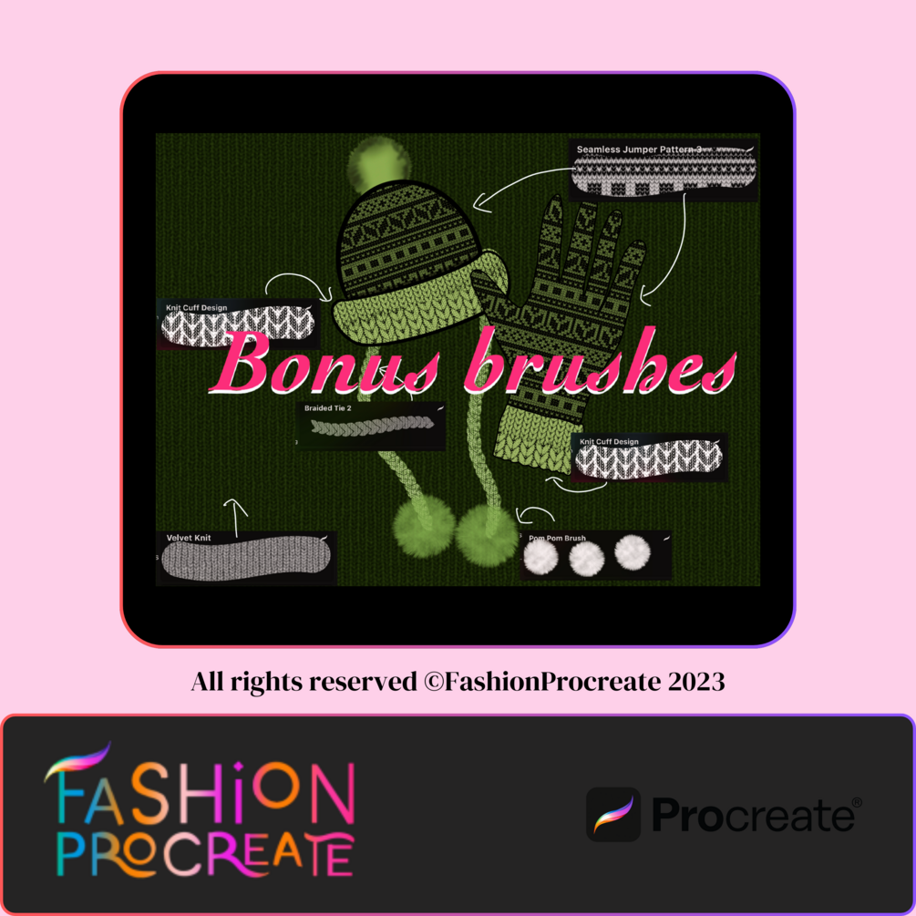X4 PROCREATE.BRUSHSET FILE( 13 SEAMLESS SWEATER PATTERNS SETS ) - BONUS: X1 PROCREATE.BRUSHSET FILE (KNIT DETAILING BRUSH SET) includes: * Velvet textured knit pattern * Multicolor Velvet textured knit pattern * Knit cuff design * Knitted scarf * Pom pom brush * Multicolor Pom pom brush * 2 Braided tie