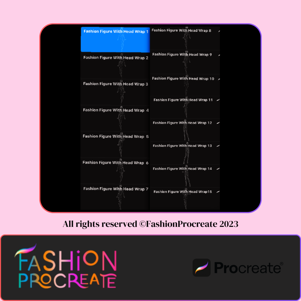 🌟 1 .brushset file containing the 15 Procreate Fashion Figure Template Stamps with Stylish Head Wraps.