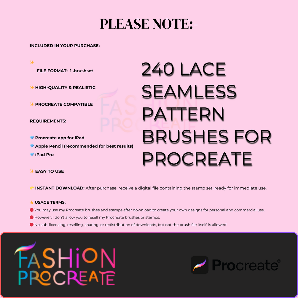 240 Procreate lace seamless pattern brushes, PDF ZIP file